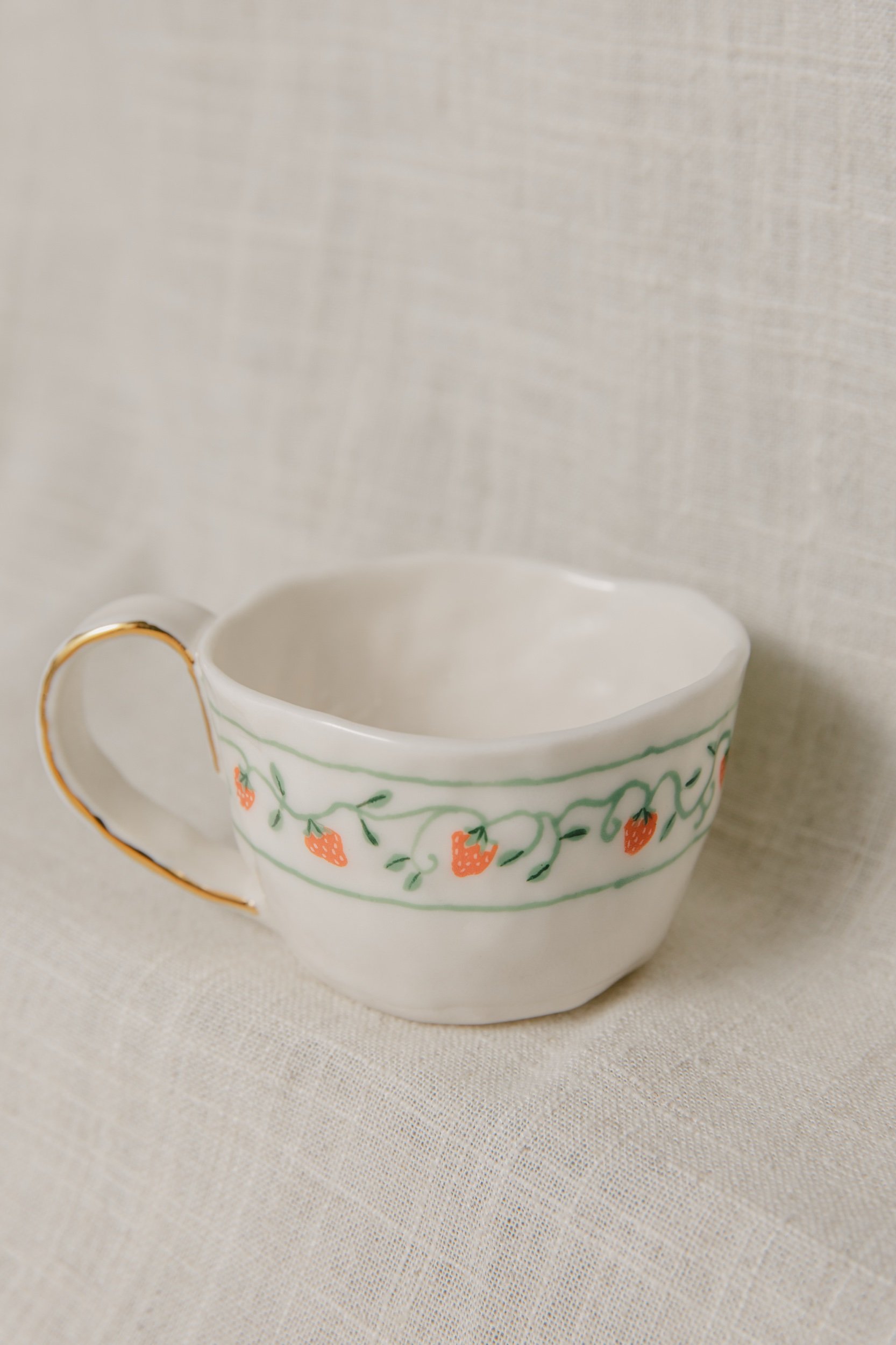 A handbuilt porcelain coffee mug featuring a hand-painted strawberry vine motif and a delicate accent of 22k gold luster on the handle. Each mug is shaped and painted individually, giving it a soft, slightly irregular form that feels warm and personal.